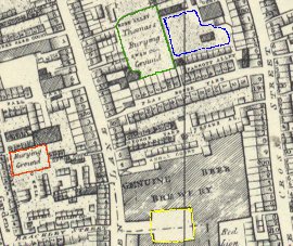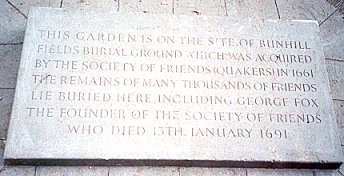 The Friend’s Burial Ground, Bunhill Row. Remaining portion now a small park and playground. The Memorial Building is still there. The remainder of the ground has some low-rise housing on it. Acquired in 1661, many times added to, and chiefly used by the Friends of the Peel and Bull-and-Mouth divisions. In 1840 a school was built in it. The existing portion is about ½ acre in size, and is neatly kept as a private garden; but the remainder was used as the site for a Board School, a coffee palace, houses and shops, including the Bunhill Fields Memorial Buildings, erected in 1881. (Holmes) |