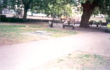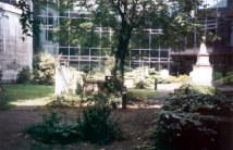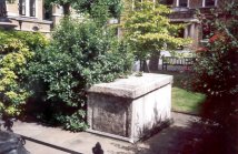 Wesleyan Chapel-ground, City Road. All tidily laid out. Part of the the area at the back of the chapel is paved, yet with tombstones in situ underneath a modern building raised on pillars; the appearance is somewhat bizarre. ½ acre. The part in front of the chapel is neatly kept, but the part behind is closed and not so tidy. Wesley himself was buried in a vault here. (Holmes) |