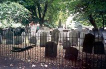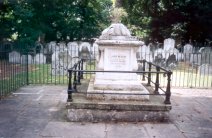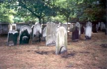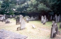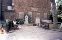 Bunhill Fields. Tidy, but still very much a graveyard. The crowded tombstones give a vivid picture of the appearance of most London grounds a hundred years ago. Burial place of Blake, Bunyan, and Defoe. During the first part of the nineteenth century around 1000 burials a year took place here. In 1841 a letter to The Times complained of its foul smell, affecting “particularly females of high nervous sensibility, who are doomed by their necessities to domicile in the neighbourhood of such localities”. 5 or 6 acres. This was originally two grounds, the southern part having been intended for burials in the Great Plague, but not being used was let by the Corporation to a Mr. John Tyndall, who carried it on as a private cemetery. Subsequently the northern part was added, and the whole ground extensively used for the interment of Dissenters. The Corporation maintain it as a public garden, but the tombstones have not been moved, and only the gates at the eastern end are generally open. (Holmes) |