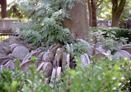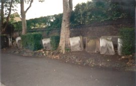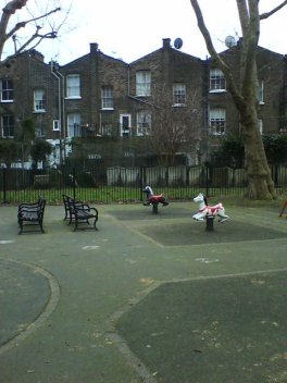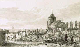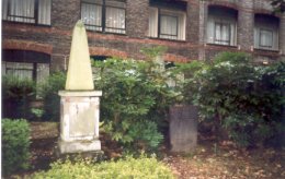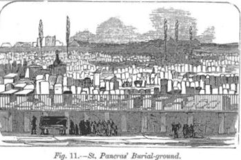 in Pratt Street. Ground purchased by St Martin in the Fields in 1805. In use until 1856, at first for St Martin's parishioners (mainly the poor) then later for other parishes. Now a not especially exciting open space, with gravestones around the edge. To the south these have been arranged in a rather odd herring-bone pattern for no obvious reason. Over 18,000 burials recorded at the site. 1¾ acres. This was consecrated in 1805; It is now a well-kept public garden under the control of the St. Pancras Vestry. A part appears to have been appropriated as a private garden for the almshouses and as a site for a chapel and other buildings. (Holmes) On Saturday morning, about 4 o’clock, a party of resurrection men scaled the walls of St Martin’s burying-ground situated in the fields at the back of Camden-town, for the purpose, as it is supposed, of stealing the body of a grenadier nearly 7 feet high, who had died in the poor-house of that parish, and had been buried in the above mentioned place of interment. The sexton, to guard the ground, had, more ingeniously than lawfully, put together a number of gun-barrels so as to form a magazine, that they might all be discharged together. After burying the bodies of the paupers, he made it a practice to direct the muzzle of this formidable engine towards the mound of earth which was the general receptacle for the dead parochial poor, and having a string fixed to the trigger, he fastened the other end of it round a large piece of wood, which he buried in the grave about a foot below the surface of the ground, so that if anyone should attempt to dig, they must necessarily remove the above piece of wood, the string would pull the trigger, and a volley of bullets would immediately sweep that quarter of the burying ground. On the morning in question, about half past 4, he heard a tremendous report, and concluding it was his new piece of ordnance, he went out as soon as possible, and on arriving at the guarded spot, he found some spades, shovels, pick-axes, and other resurrection paraphernalia. Among other things he found a man’s hat, through one side of which a bullet had evidently passed; but from there being no track on the other side of it, it is concluded that the bullet had lodged in the head of the owner and killed him, and that he had been carried off by his associates. (The Times, Jan 29, 1817) |