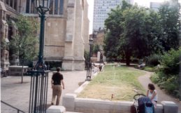 Christ Church Churchyard, Blackfriars Bridge Road. Probably earlier than Holmes suggests below: Woollacott gives 1671 as date of first burial. Church consecrated 1671, rebuilt 1741, graveyard extended at that time and again in 1817. Ground closed 1856. Opened as a public garden in 1900. Church destroyed in WW2, rebuilt 1960 as an uninspiring brick box. The churchyard is quite attractively laid out. In March of 1818 the bodies of three adults and a child were 'torn from their graves' by body Snatchers, the wall around the ground being 'too low and defective for the purposes of security' (The Times March 20th 1818) Crypt cleared 1895 when it was discovered that lead coffins were being melted by the heat from the newly installed boilers. 650 bodies removed to Brookwood. This dates from about 1737, and has been enlarged. An infant school was built in it. It is closed, and not laid out. (Holmes) |